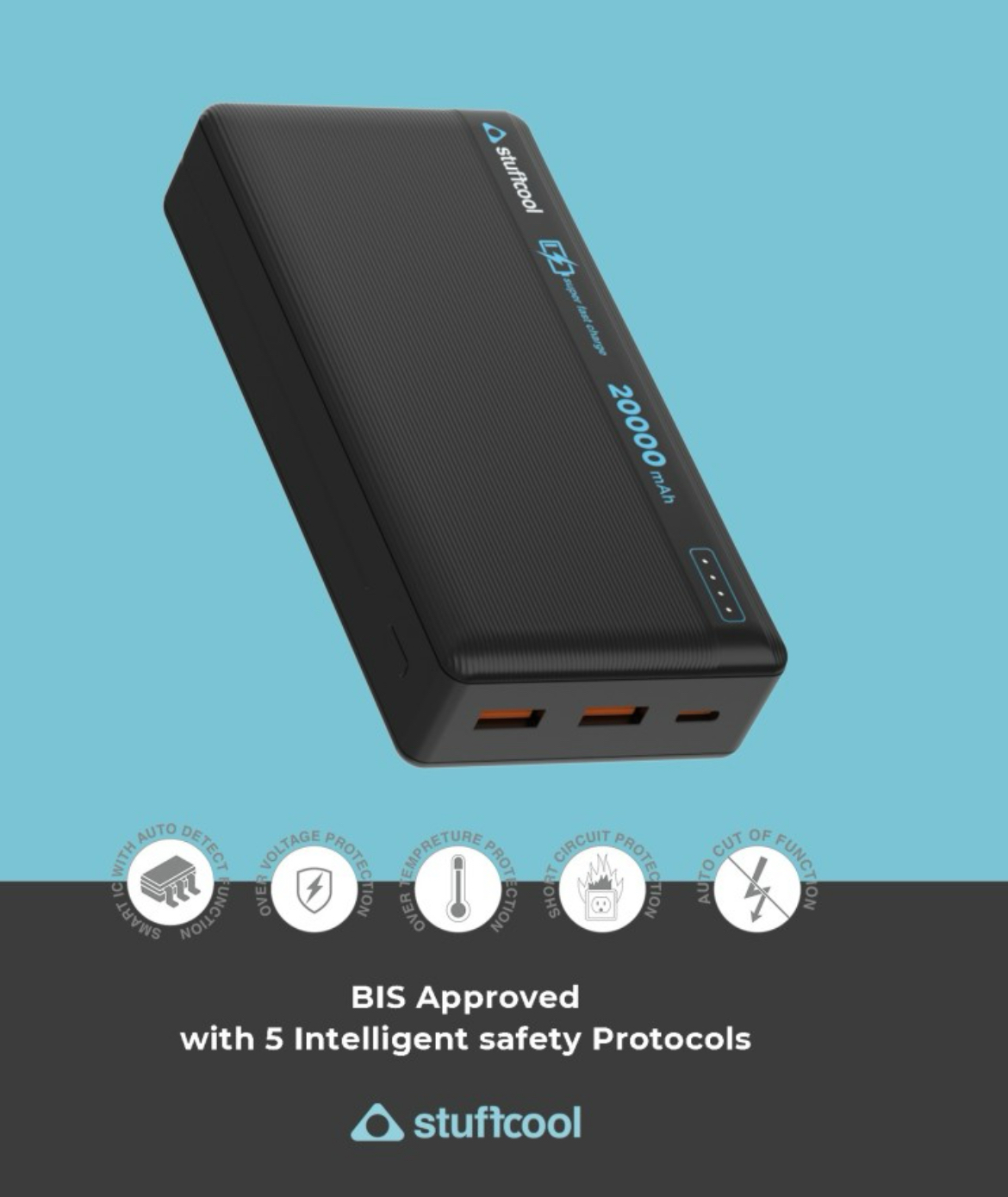 Stuffcool Major Plus 20000mAh 20W Type C PD, 22.5W QC3.0 Type A Port Fast Charging Powerbank, Charges iPhones 50% in 30 mins, Supports Fast Charging for Galaxy, Pixel and Other Android Devices